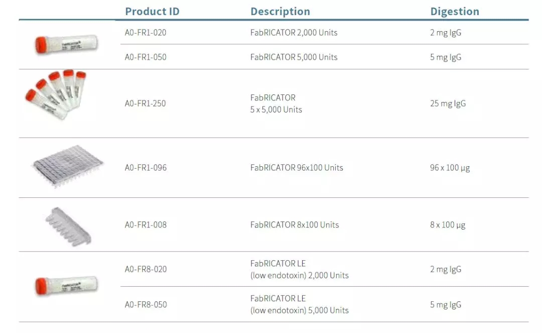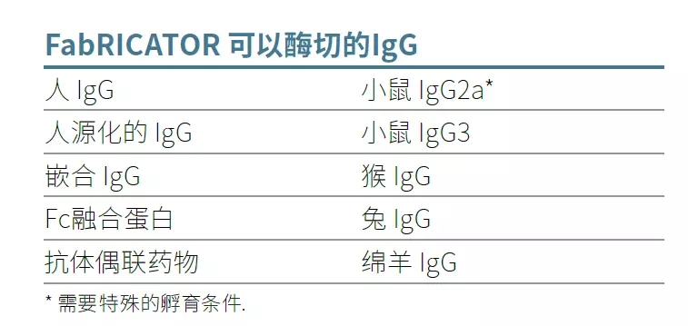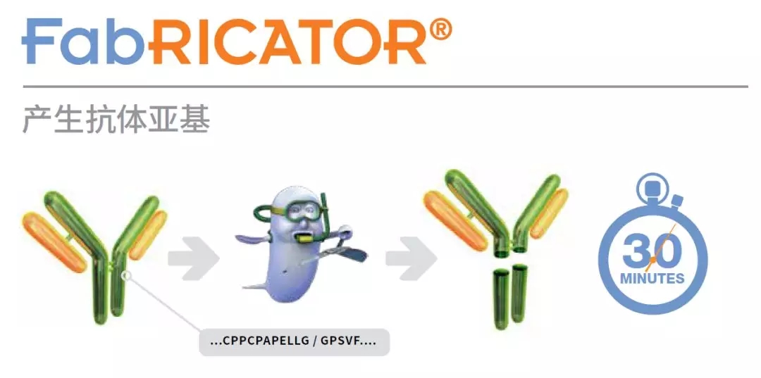 FabRICATOR® (IdeS) 是一种独特的半胱氨酸蛋白酶,在铰链区下方的一个单一氨基酸位点酶切IgG。仅需30分钟就可以完成酶切反应,而且不需要条件优化。