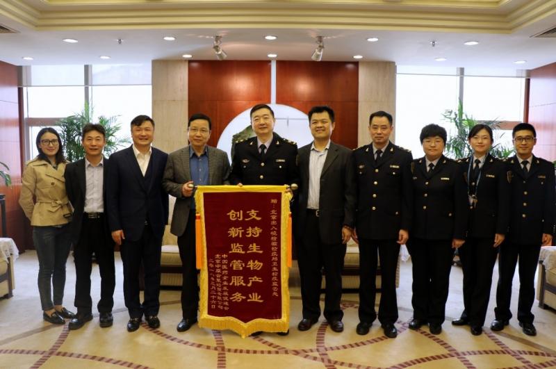 2018年3月28日,中国医药企业发展促进会(以下简称“促进会”) 副会长姚桐利和中原公司总裁朱晓勇、副总裁李志刚一起,向北京出入境检验检疫局(以下简称“北京国检局”)卫生监督处赠送了锦旗,为其多年来对我国生物医药产业的大力支持,不断创新监管服务表示感谢。北京国检局副局长邵白、卫生处处长黄健华代表北京国检局表示感谢并进行了亲切座谈。