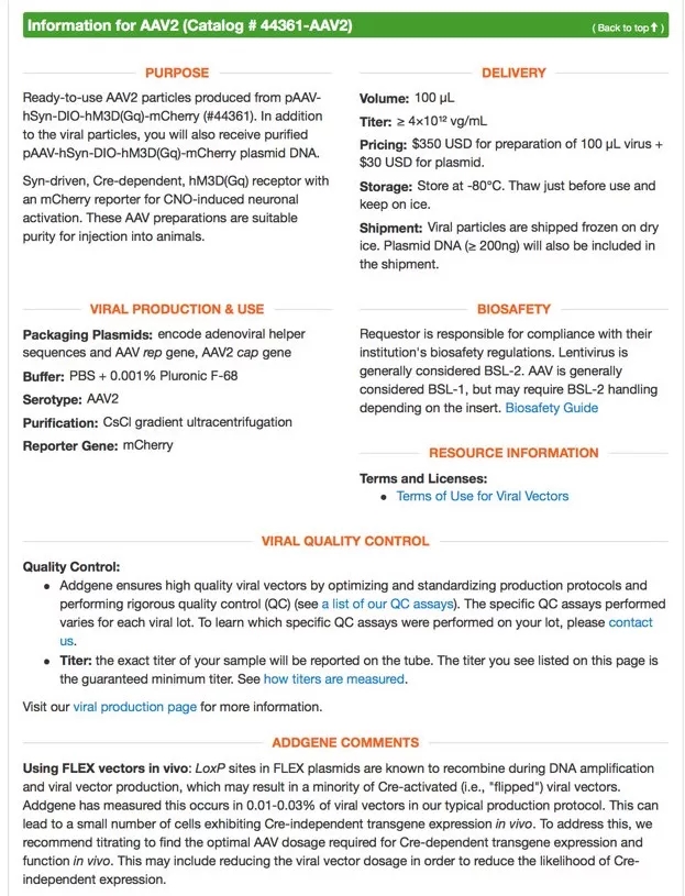 6. ADDGENE COMMENTS:Addgene公司对每个病毒制剂的补充说明运输规格、病毒应用、病毒相关DNA的应用等相关信息。
