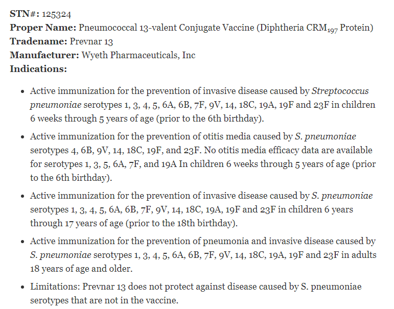 然而,为了将疫苗覆盖范围扩大到其他血清型,辉瑞的一种13价肺炎球菌结合疫苗(PCV13,Prevnar13®;辉瑞)后来获得了儿童和成人使用许可。PCV13是由包含PCV7中的相同血清型多糖与蛋白结合物,以及血清型1,3,5,6A,7F和19A的多糖结合物组成的。
