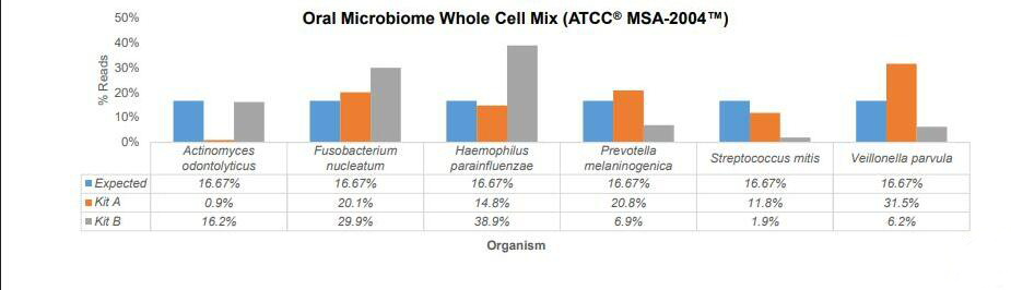 ATCC通过使用两种商业化核酸提取试剂盒对口腔拭子标准品分别做提取实验(图2),与预期结果做对比以此来优化核酸提取方法。(口腔拭子基因组标准品ATCC® MSA-1004™和口腔拭子全菌株标准品ATCC® MSA-2004™,均为通过细胞计数等量分配菌株或经荧光定量后等量分配基因组拷贝数产品。)