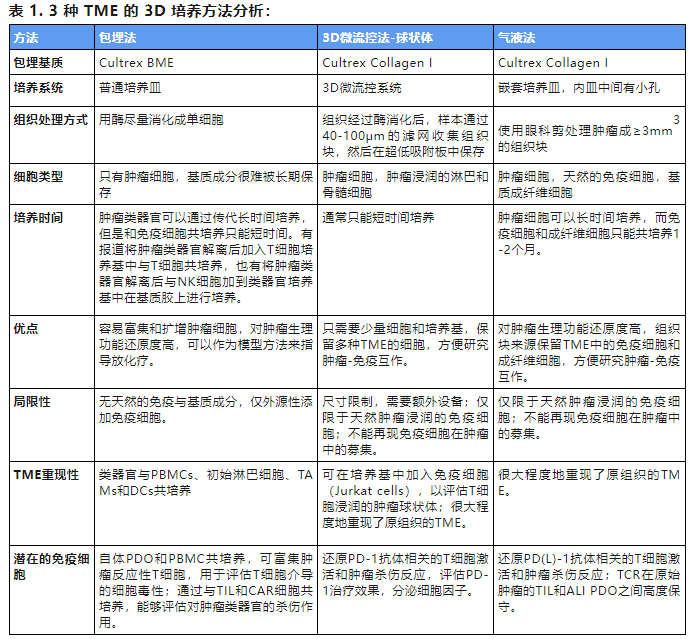 两类培养模型采用的 3D 培养方法一般有 3 种:类器官模型选用气液法和包埋法;球状体模型选用 3D 微流控法。通过以下两张表的总结,快速掌握各个培养方法的特点和选用的工具。