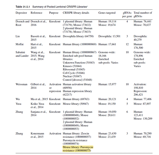 下表总结了Addgene收藏的慢病毒CRISPR文库
