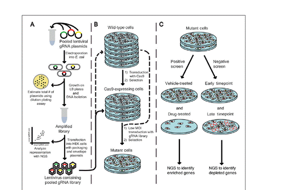图2备注:使用混合慢病毒 CRISPR 库的实验流程图。 (A)gRNA 文库的扩增与验证以及慢病毒的产生。将质粒 DNA 转化至大肠杆菌中,并在含有相应抗生素的 LB 琼脂平板上培养。通过对转化样本进行稀释培养可以估算转化中的质粒总数(例如,稀释培养法)。从转化的大肠杆菌中分离出扩增的库并进行 NGS 检测,以比较扩增库与原始库存的代表情况。然后将扩增且经过验证的库转染至带有适当包装和包膜质粒的标准HEK细胞或慢病毒包装细胞系中,以生成慢病毒 gRNA 库(含 Cas9)。 (B)通过单个 gRNA 与 Cas9 的共表达生成突变细胞。对于多载体 CRISPR 库,必须在转染 gRNA 库之前先生成一个表达 Cas9 的稳定细胞系(实线)。对于单载体库,可以直接从野生型细胞一步生成突变细胞(虚线)。无论哪种情况,使用 gRNA 库进行转导时的摩尔浓度必须较低(<1),以确保每个细胞仅含有单一的 gRNA(每一步中减少的培养板数量表明,随着每次筛选的进行,细胞总数会减少)。(c)使用 CRISPR 工程突变细胞进行筛选。混合CRISPR文 库与阳性筛选或阴性筛选兼容。在阳性筛选(如药物耐药性筛选)中,突变细胞会接受药物或载体对照处理,并使用 NGS 来识别能赋予药物耐药性的 gRNA(即基因)。在阴性筛选(如细胞存活筛选)中,突变细胞会在有限的时间内生长,并使用 NGS 来识别与初始时间点相比在较晚时间点减少的基因。
