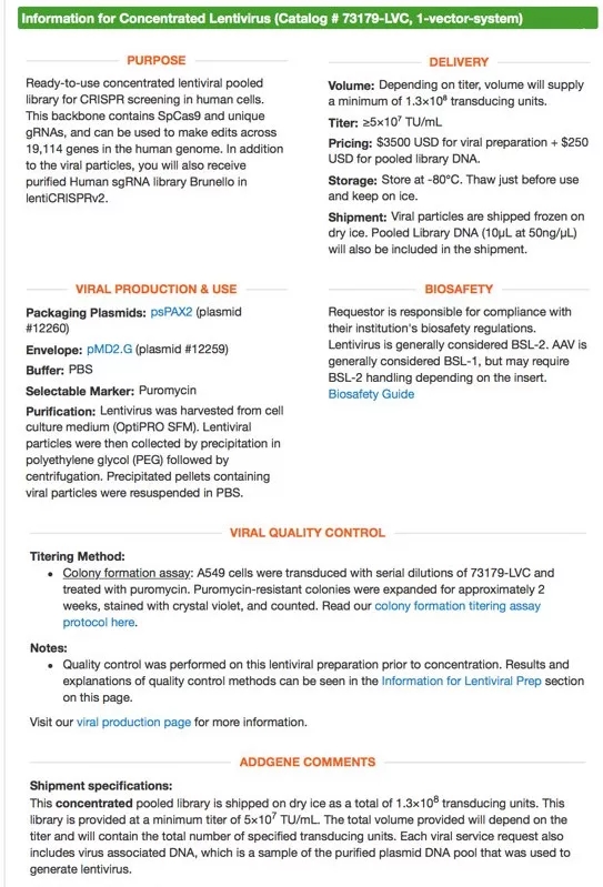 更多关于慢病毒的信息可以登录Addgene官网上的信息页面: