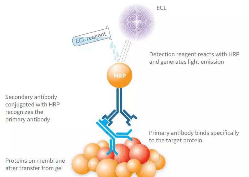 HRP标记时显色多用ECL试剂,即底物鲁米诺和过氧化氢,HRP催化鲁米诺产生多步氧化反应,使之从基态跃升至激发态并伴随产生428nm的低强度发射光,可以利用CCD或胶片进行检测,ECL检测灵敏度极高,目前多个厂商正在挑战fg级别。另外有小伙伴会问DAB也可用于HRP标记的显色,为什么应用在Western里面很少呢?尽管DAB显色可以产生棕红色的可见条带非常利于观察,但是DAB显色灵敏度较低,对底物的量要求在500pg以上,所以多用于组化显色。还有一种AP碱性磷酸酶标记的二抗多用BCIP/NBT试剂盒进行显色,BCIP在碱性磷酸酶的作用下水解,水解产物和NBT发生反应产生肉眼可见的不溶物,形成有颜色条带,加水后可以终止反应(小编依然清楚的记得第一次做AP显色看到条带时激动的拿着洗瓶挥舞的自我),BCIP/NBT显色灵敏度在100pg左右。这下知道为什么大多的客户都选择ECL显色了吧,毕竟高丰度的蛋白没那么多哦。