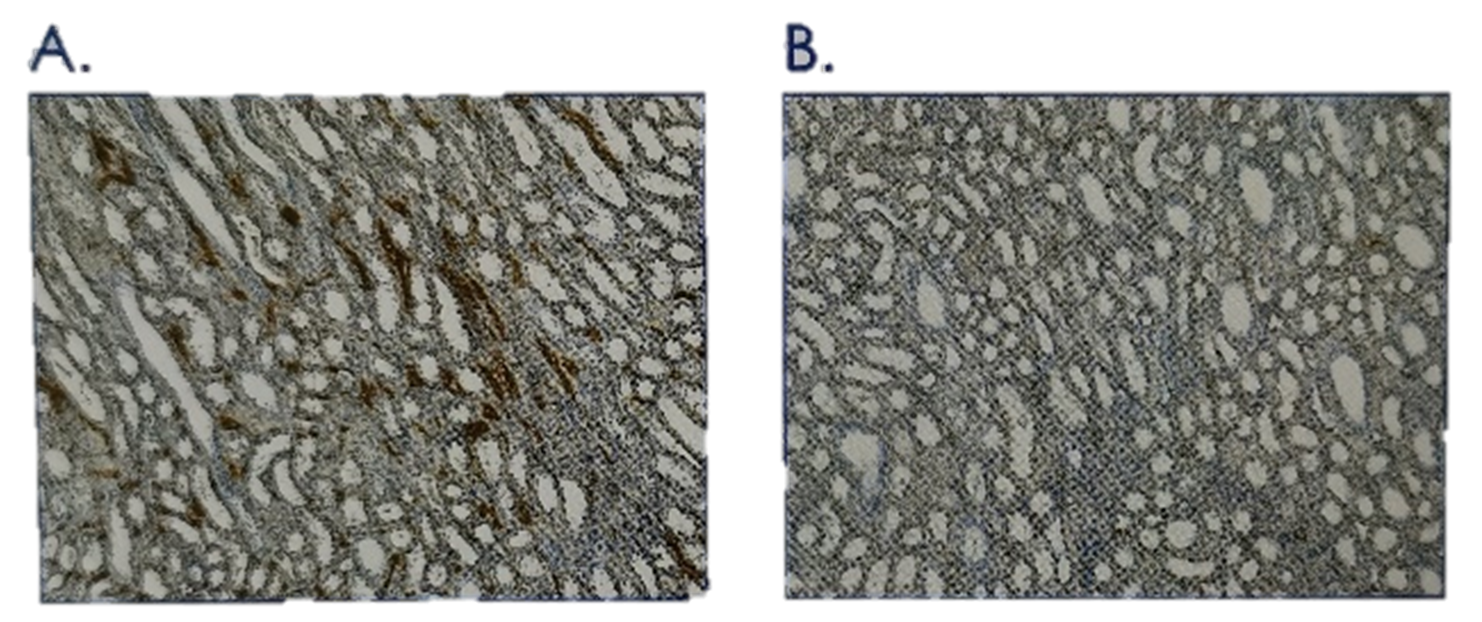 H2O2处理可以清除内源性过氧化物酶活性。A. 在染色前未清除内源性过氧化物酶活性的人类肾组织切片呈现出假阳性信号。组织染色用的是anti- goat HRP-DAB Cell & Tissue Stainingkit(货号CTs0o8;褐色)。B. 同一组织在染色前于室温下用3% H2O2的甲醇溶液处理15分钟,去除内源性过氧化物酶活性。