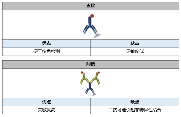 相比之下,间接检测方法通常有着更高水平的灵敏度,并产生更强烈的信号。信号经过间接方法放大,因为至少有两个标记的二抗与每个一抗结合。不过,二抗的使用需要额外的封闭步骤和对照。