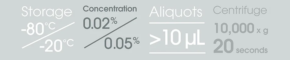 有些研究人员向抗体中加入冷冻保护剂甘油(最终浓度为 50%)以防止冻融损坏;甘油可将冷凝点降至 -20 ℃ 以下。虽然这种方法可用于多种抗体,但我们仅对少数几种 Abcam 抗体在这种保存条件下的稳定性进行了测试,我们仅担保遵循数据表建议进行保存的抗体的性能。我们不建议在 -80 ℃ 下保存含甘油的溶液,因为该温度低于甘油的冷凝点。请注意,甘油可能会被细菌污染。如果加入了甘油或任何冷冻保护剂,应当小心操作,确保获得无菌制备物。