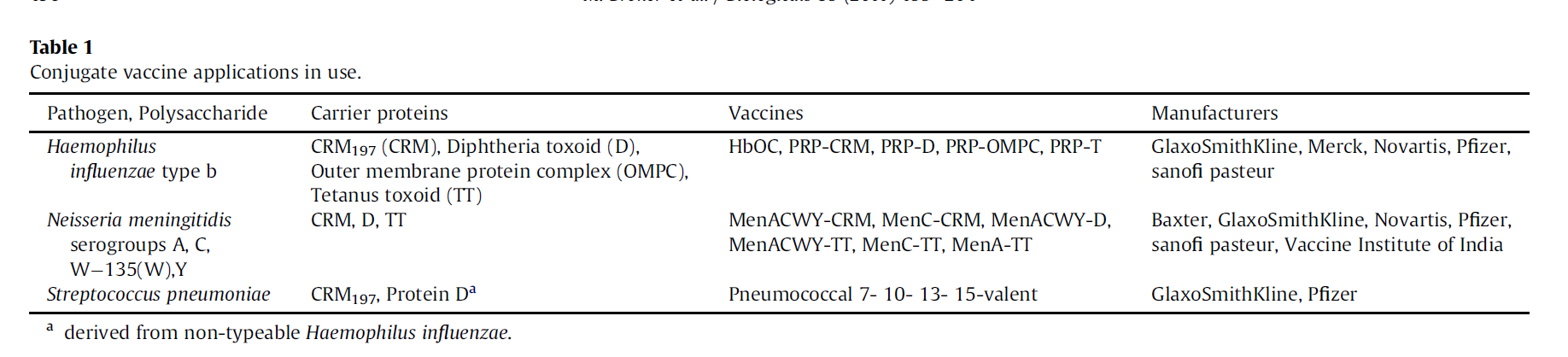 表1 已在应用的结合疫苗