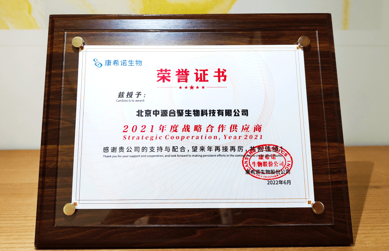 【喜讯】中源公司喜获康希诺生物2021年度战略合作供应商荣誉证书